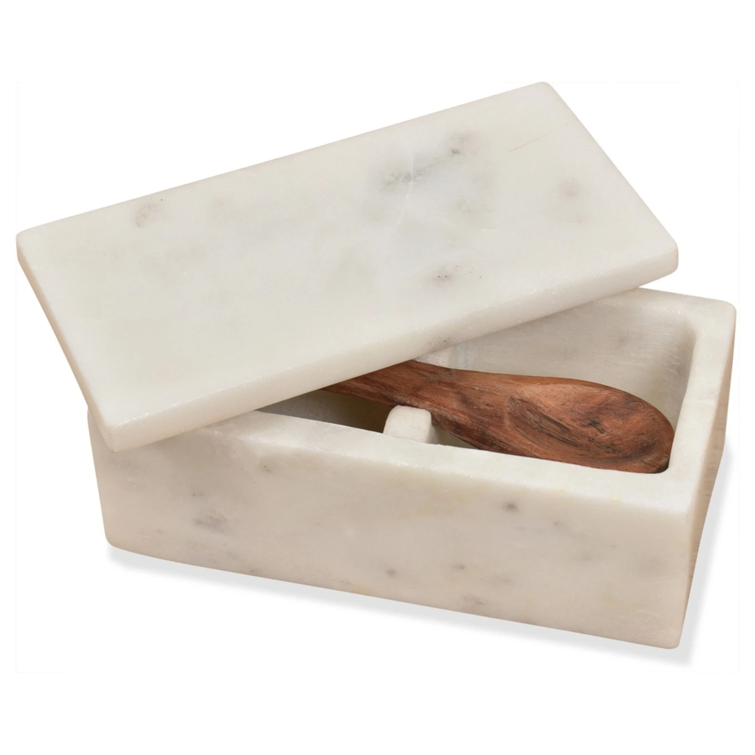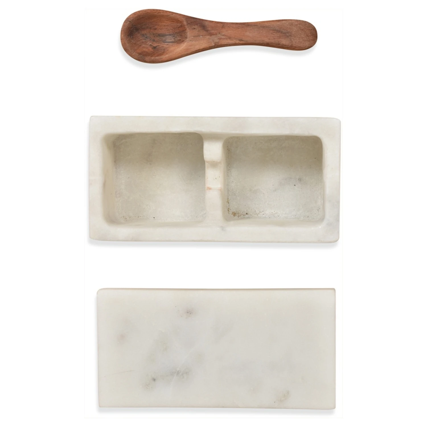 Une jolie boîte à sel et poivre en marbre signée munie d’un couvercle et d’une mini cuillère. La couleur, l’apparence et la forme de la boîte peuvent légèrement varier d’un exemplaire à un autre.