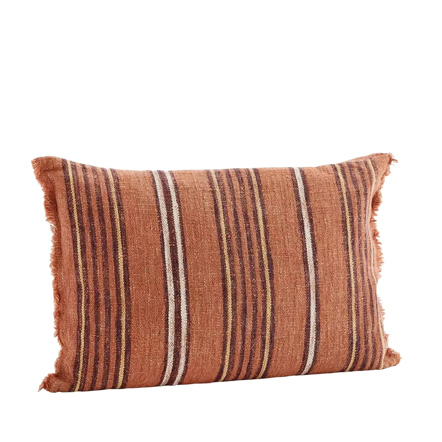Un joli coussin rectangulaire rayé à franges de la marque , frabriqué en lin et en coton.