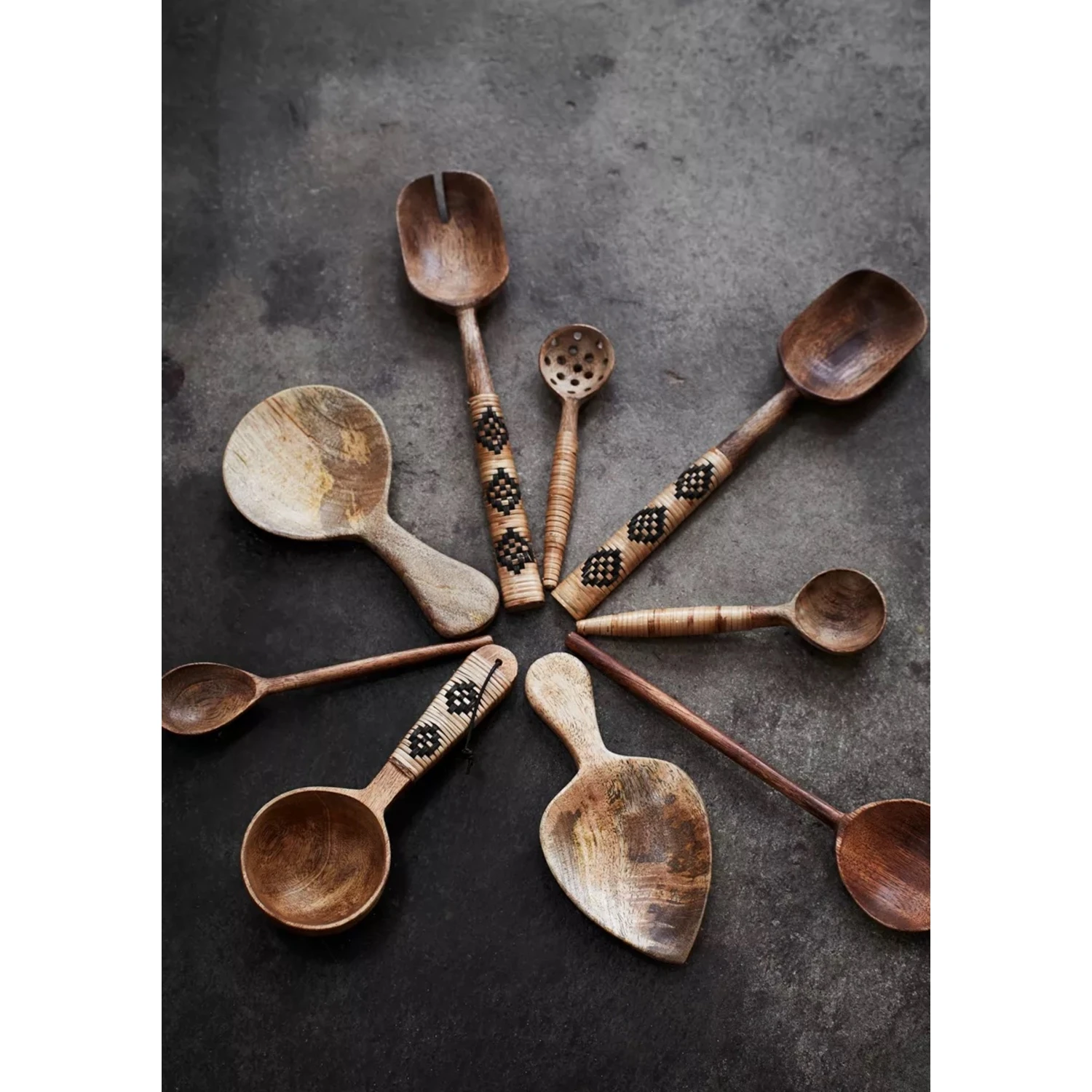 Un superbe ensemble de 2 cuillères en bois de manguier tressées en bambou naturel et noir de la marque scandinave …