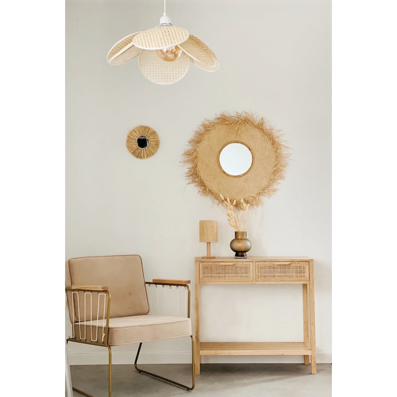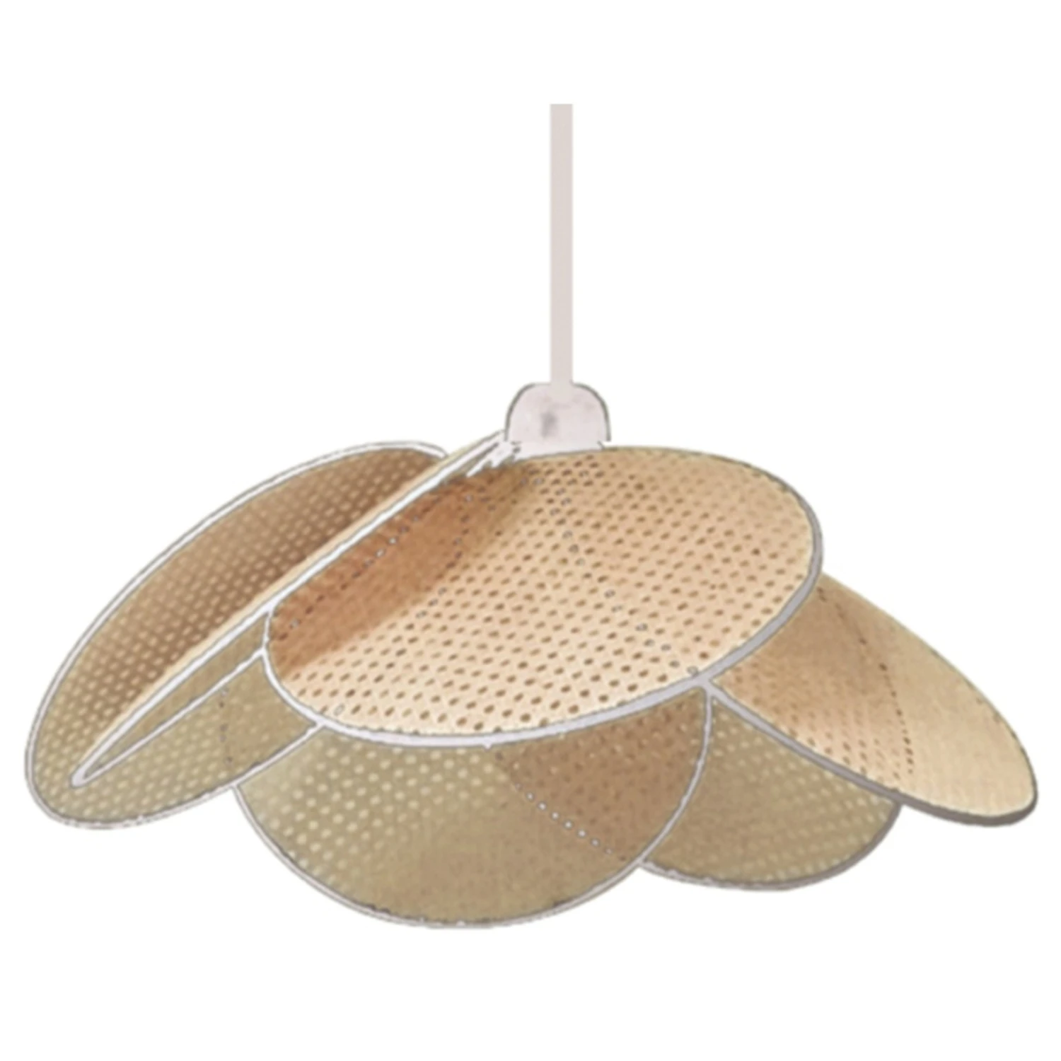 Cette jolie suspension Fleur en cannage de la marque apportera une touche de poésie à votre intérieur… Originale, cette suspension à été imaginée à partir de pétales juxtaposés les uns sur les autres… La suspension est composée d’un abat-jour en rotin et d’un système électrique en métal (câble + douille + rosace).