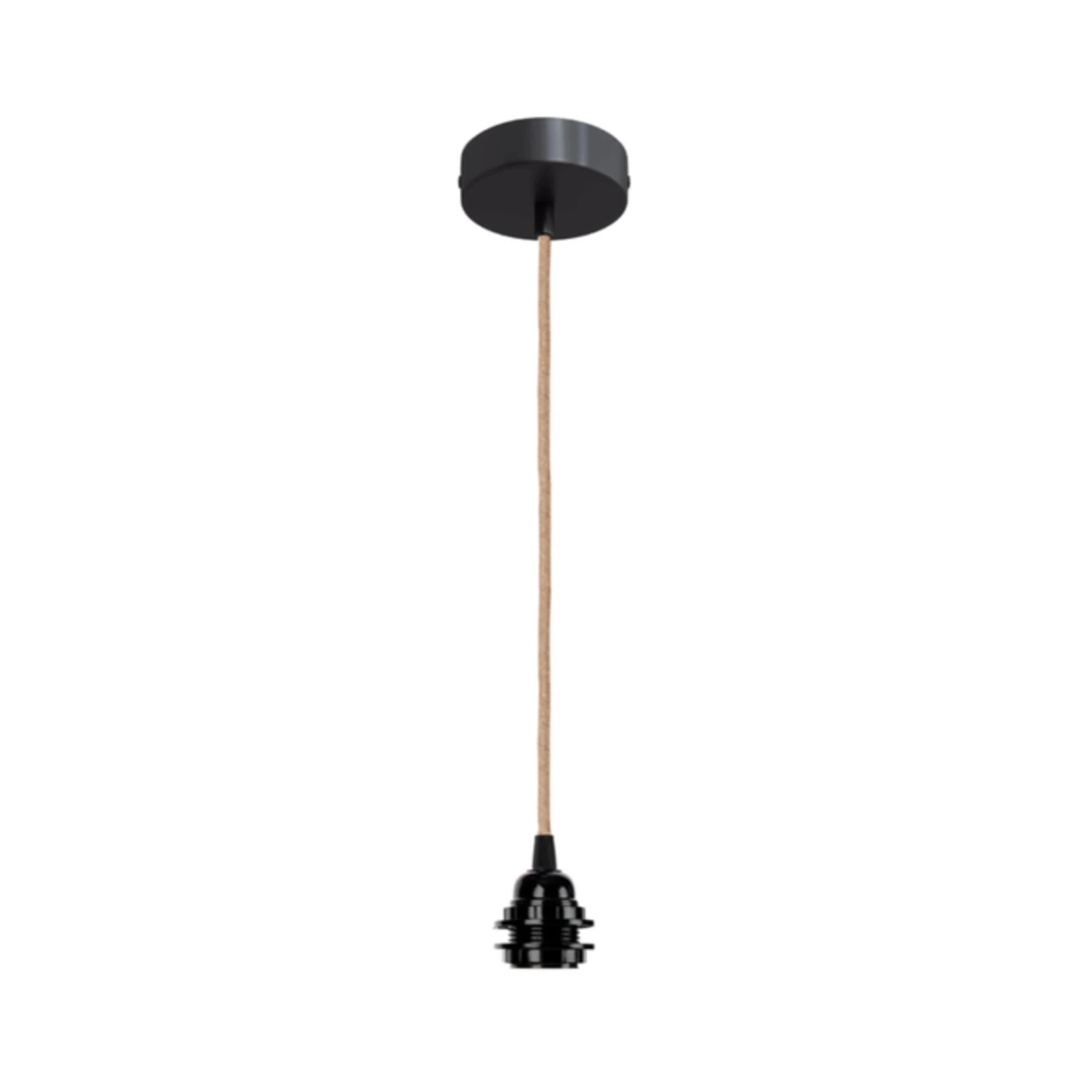 Suspension composée d’une douille et d’une rosace en plastique noir satiné ainsi que d’une corde naturelle d’une longueur de 110 cm.