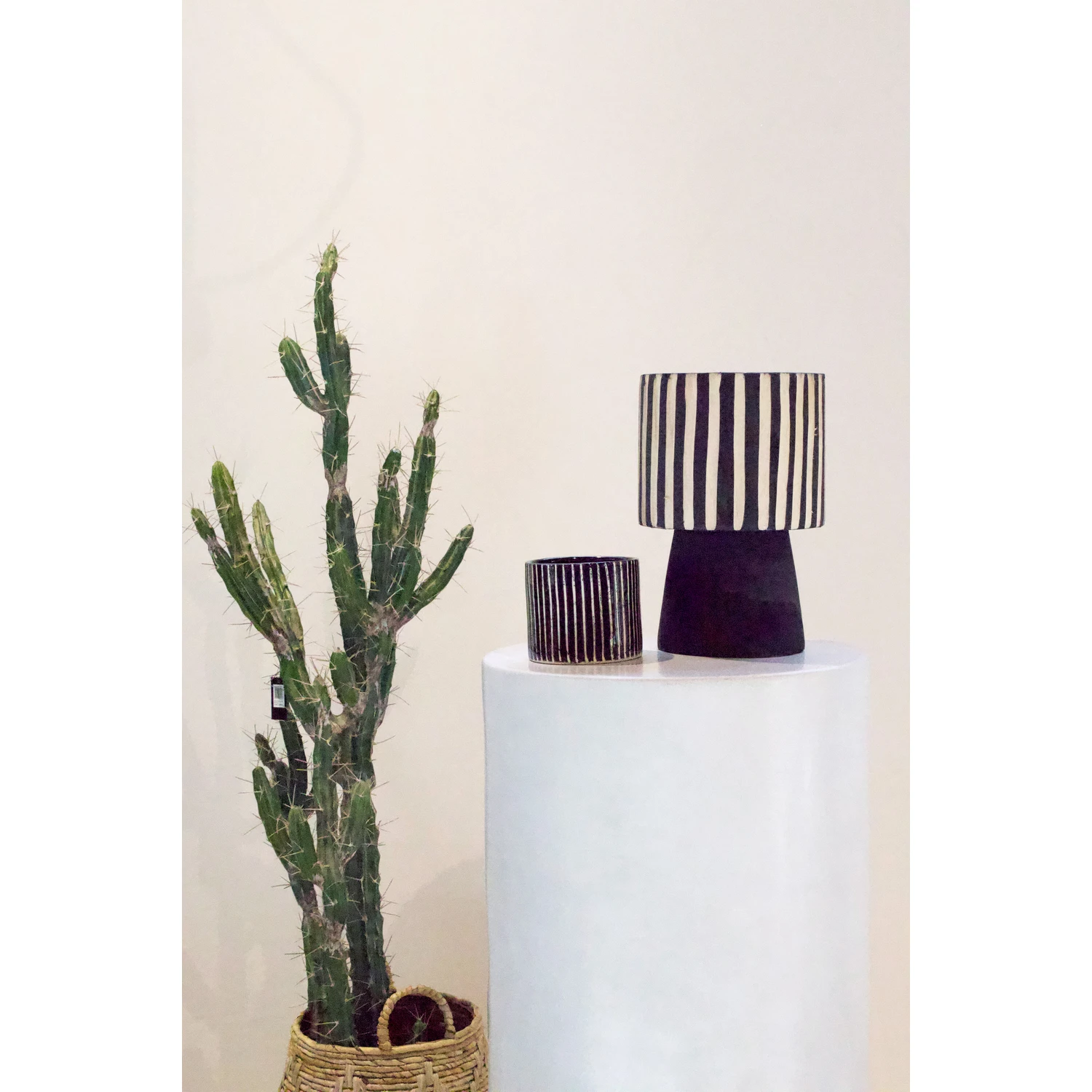 Un sublime vase en bois de paulownia rayé naturel et noir de la marque parisienne . Il s’agit uniquement d’un objet décoratif en bois qui ne peut pas contenir d’eau en raison de son matériau de fabrication.