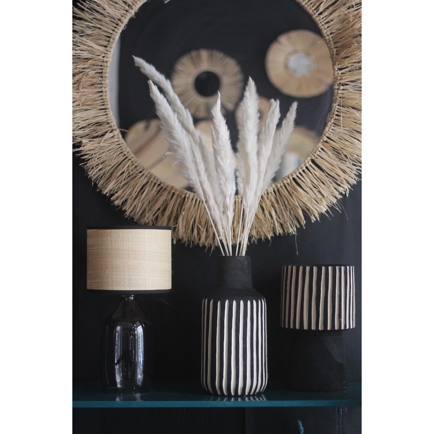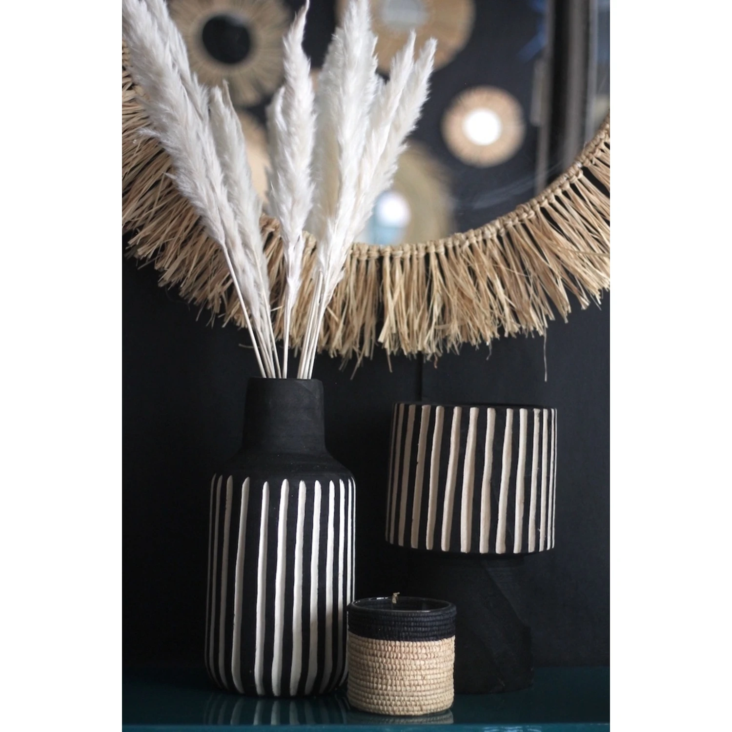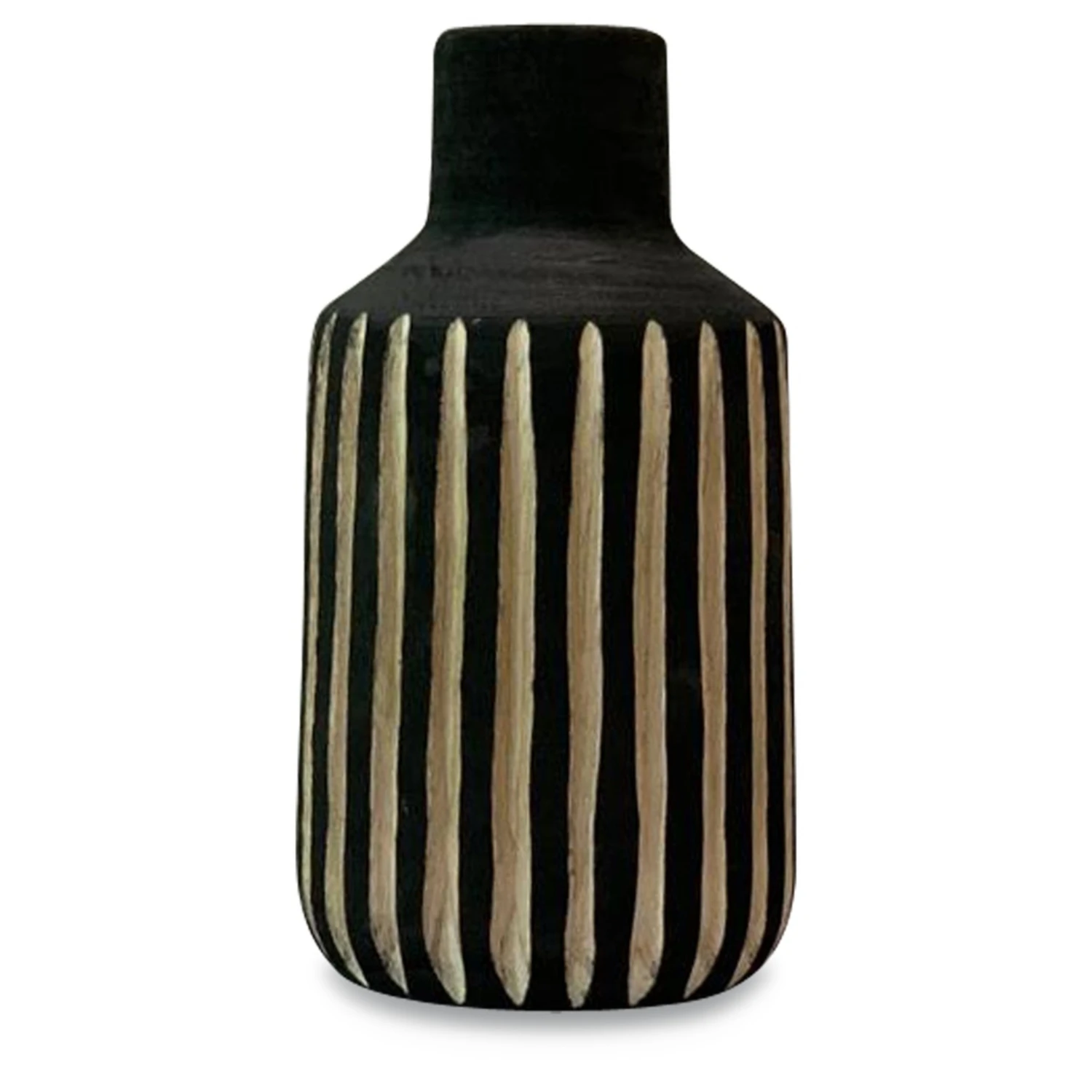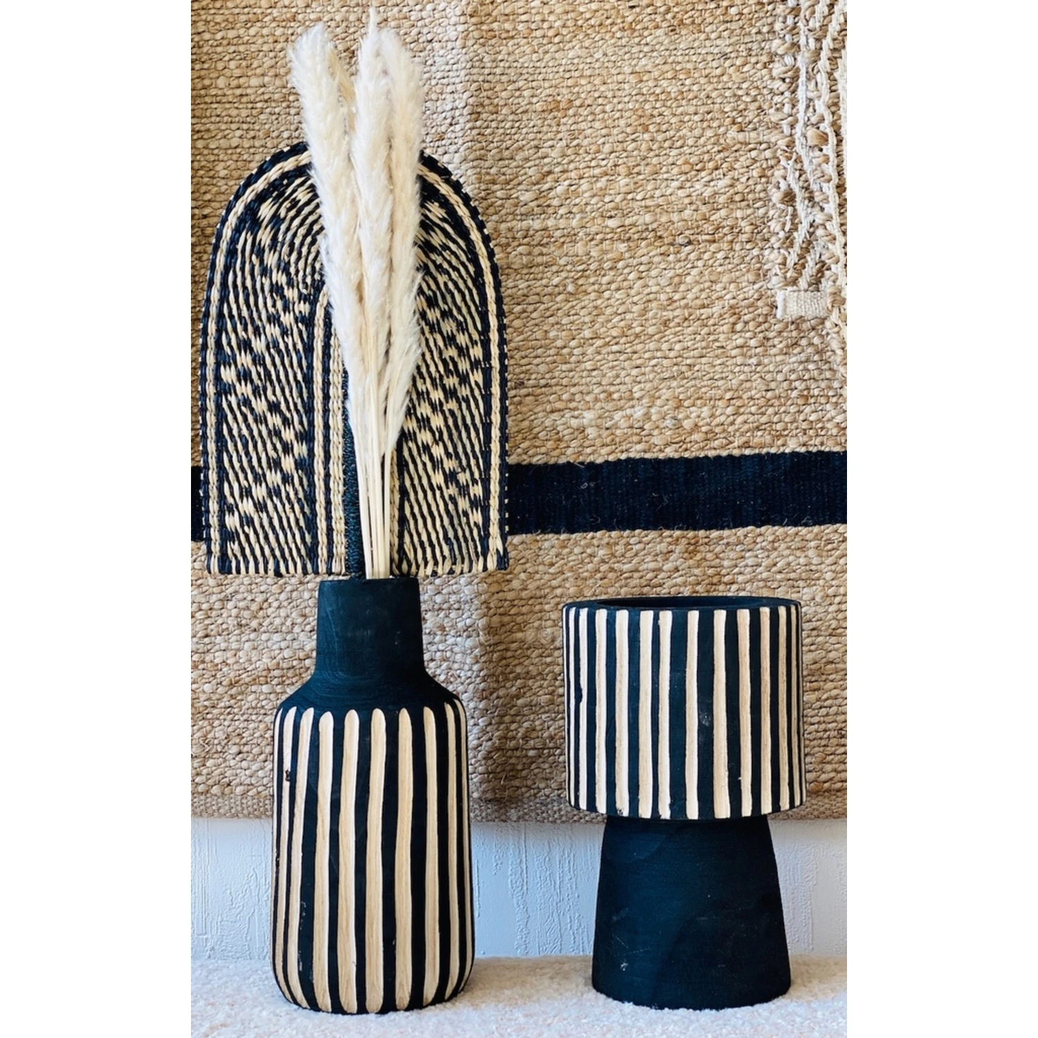 Un magnifique vase en bois de paulownia rayé naturel et noir de la marque parisienne . Il s’agit uniquement d’un objet décoratif en bois qui ne peut pas contenir d’eau en raison de son matériau de fabrication.