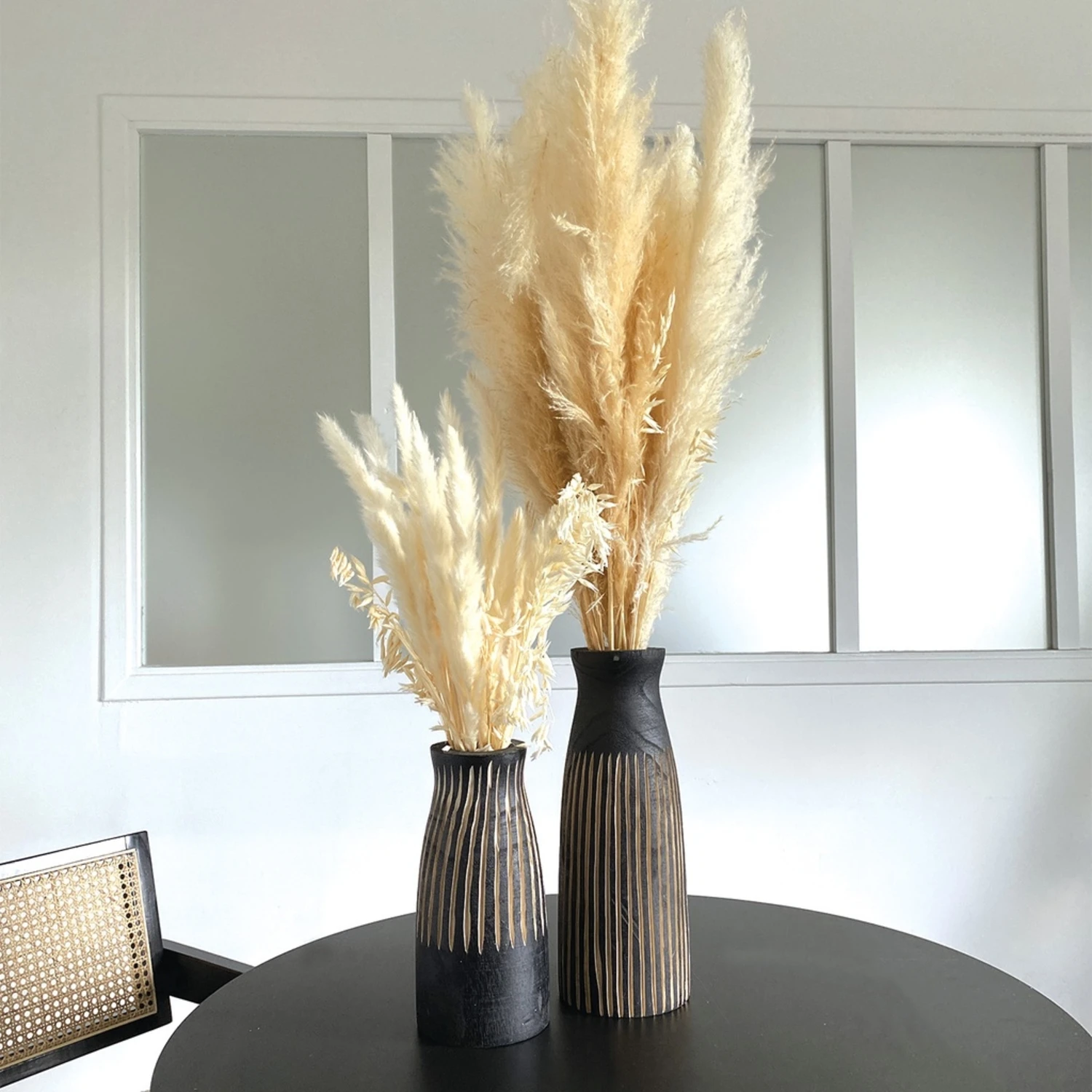 Un superbe vase en bois de paulownia rayé naturel et noir de la marque parisienne . Il s’agit uniquement d’un objet décoratif en bois qui ne peut pas contenir d’eau en raison de son matériau de fabrication.